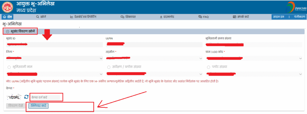 MP Bhulekh की इस भू-अभिलेख सर्विस पर आप यहां से भूमि की जानकारी (Land Record) दर्ज करके अपने ज़मीन का विवरण आसानी से देख सकते है, बस आपको जिला, तहसील, ग्राम (LGD कोड), और भूखंड आईडी (Land ID) या ULPIN नंबर आदि कुछ जरूरी जानकारी भरनी होती है। अगर आप भी अपनी जमीन की जानकारी जानना चाहते है, तो आप नीचे दिए गए स्टेप को फॉलो करें –