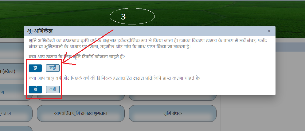 - आगे बढ़ने से पहले अब आपसे पूछे गए सवाल के जबाब दे (खसरा के लिए भूमि रिकॉर्ड खोजना चाहते हैं?, डिजिटल हस्ताक्षरित खसरा प्रतिलिपि प्राप्त करना चाहते हैं?) इन प्रश्न के आगे YES पर टिक करे।