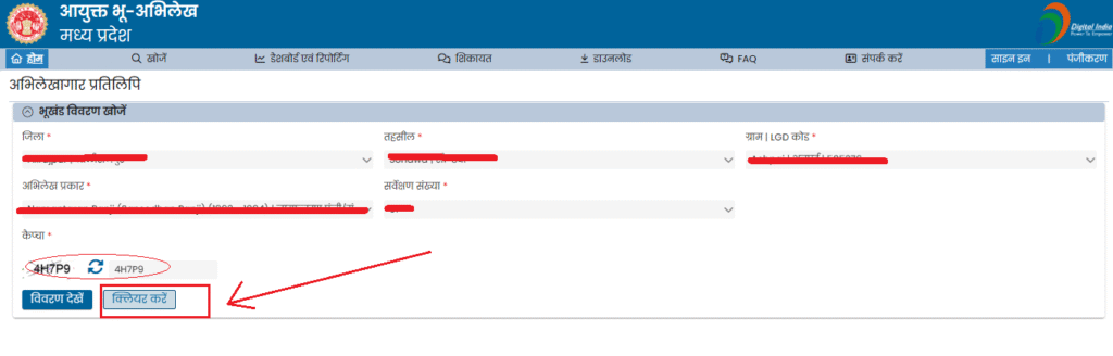 - अभिलेखागार प्रतिलिपि प्राप्त करने के लिए अपने भूखंड की जानकारी दर्ज करें: